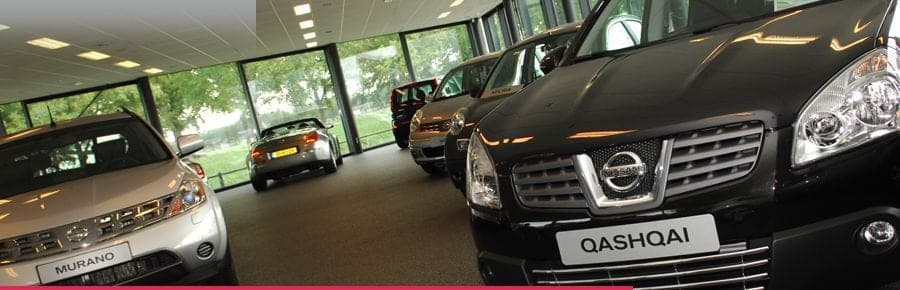 600 m² glazen showroom met alle Nissan-modellen en occasions.
